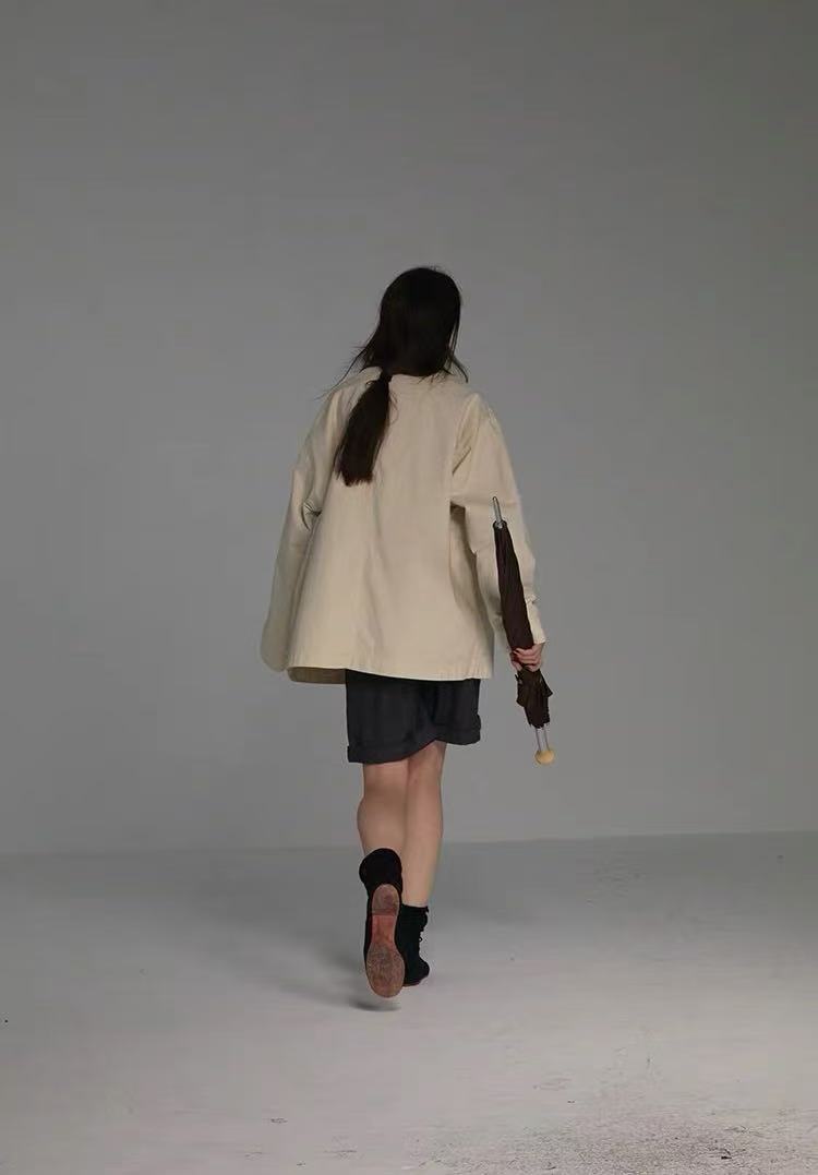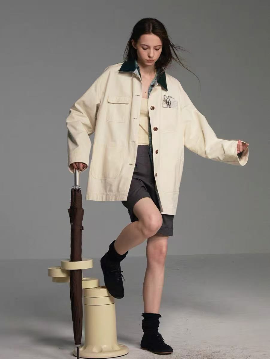 ヴィンテージ風ハンティングジャケット|月光ホワイト・配色カラー・オーバーサイズ・ワークスタイル
